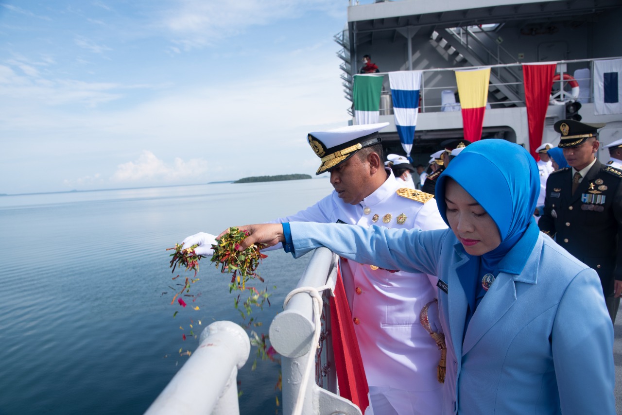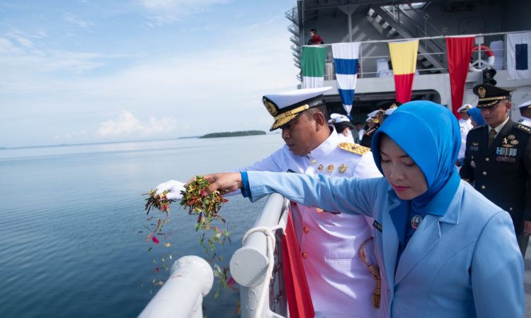 Sorong – Kepala Staf Koarmada III Laksamana Pertama TNI Rudhi Aviantara S.E., M.Si., M.Tr (Han)., CHRMP, memimpin jalanya upacara hari Dharma Samudera dan tabur bunga di atas geladak heli KRI Teluk Wondama – 527, Sorong, Papua Barat Daya (Senin, 15/01/2023).