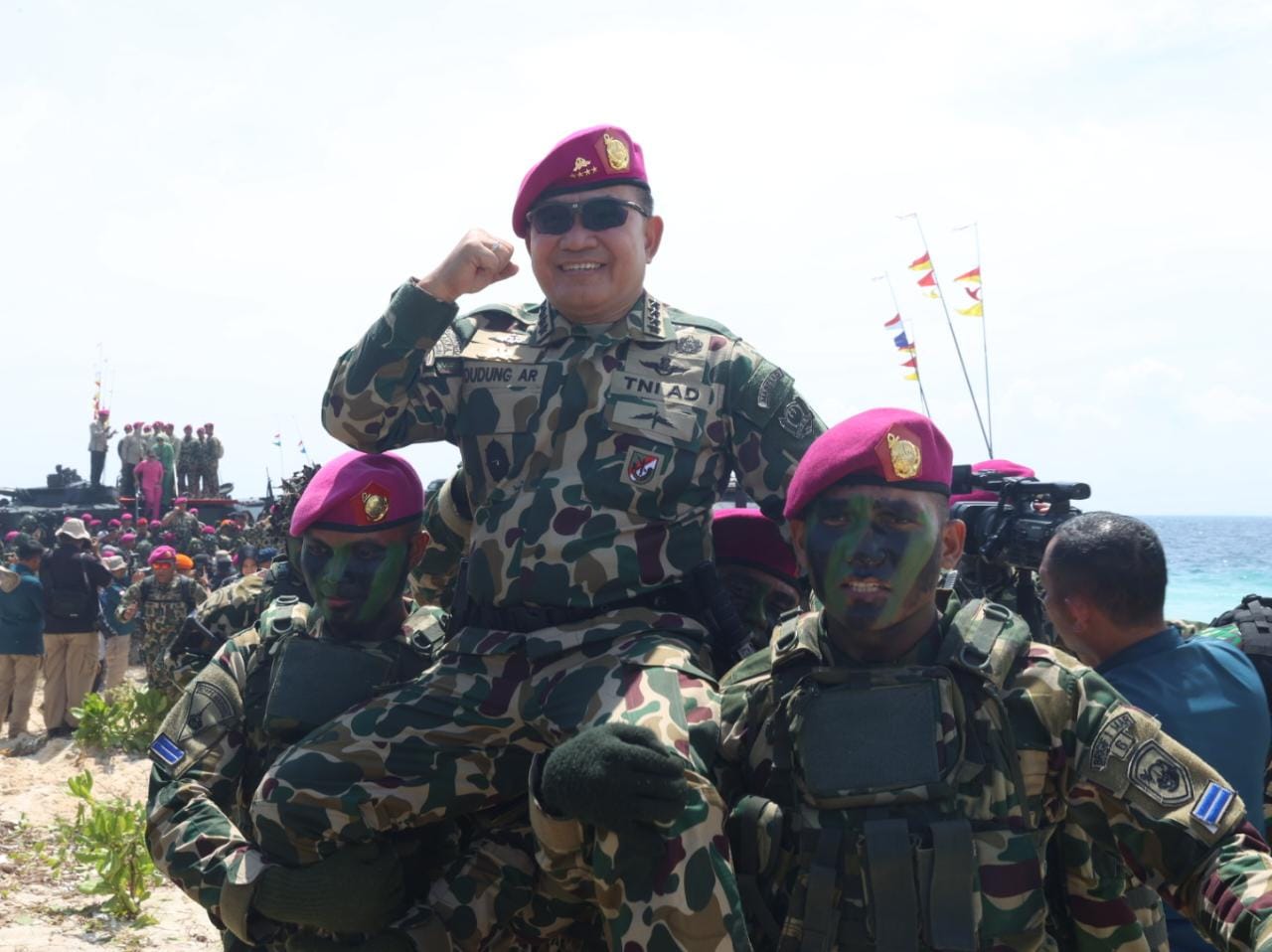 JAKARTA – Kepala Staf Angkatan Darat (Kasad) Jenderal TNI Dr. Dudung Abdurachman dikukuhkan sebagai warga kehormatan Korps Marinir TNI AL sekaligus menerima brevet Intai Para Amfibi (Taifib) dan brevet Anti Teror Aspek Laut dalam upacara yang dipimpin oleh Panglima TNI Laksamana TNI Yudo Margono, S.E.,M.M., di Pulau Damar, Kepulauan Seribu, Jakarta, Selasa (24/1/2023).