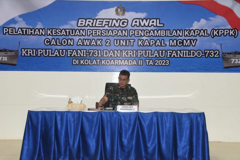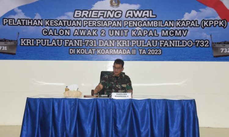 Surabaya – Pangkoarmada II Laksda TNI Dr. T.S.N.B. Hutabarat, M.M.S., memimpin Briefing Awal Pelatihan Kesatuan Persiapan Pengambilan Kapal (KPPK) Calon Awak KRI Pulau Fani-731 dan KRI Pulau Fanildo-732, jenis Mine Counter Measure Vessel (MCMV), bertempat di Puslatkaprang Koarmada II. Senin (30/01).