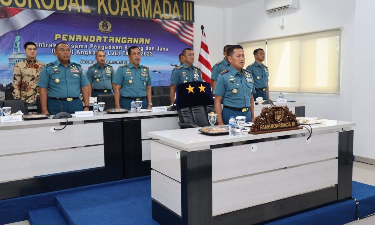 Sorong – TNI Angkatan Laut mempercepat daya serap anggaran tahun 2023 dengan melaksanakan penandatanganan kontrak bersama dengan mitra Penyedia Barang dan Jasa yang dilaksanakan secara serentak oleh TNI Agkatan Laut di Mabesal dan di satuan masing-masing di seluruh jajaran TNI Angkatan Laut termasuk di Mako Koarmada III, Katapop, Sorong, Papua Barat Daya. (Rabu, 01/02/23)
