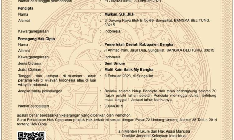 Pangkalpinang – Kepala Divisi Pelayanan Hukum dan HAM Kantor Wilayah Kementerian Hukum dan Hak Asasi Manusia Kepulauan Bangka Belitung, Eva Gantini mengatakan bahwa motif kain batik “my Bangka “ dengan pencipta Mulkan, SH,MH ( Bupati Bangka) telah dicatatkankan hak ciptanya di Ditjen Kekayaan Intektual Kemenkumham RI dengan nomor 000443615.Minggu (5/2).