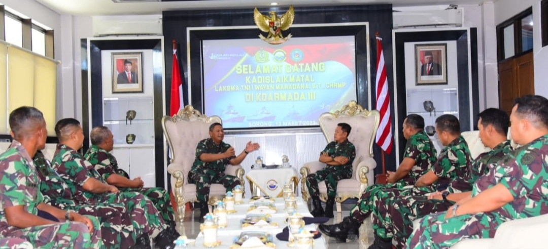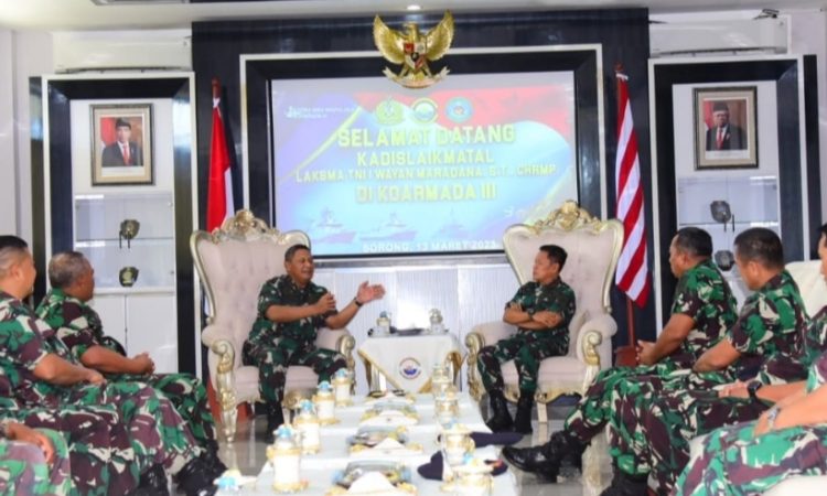 Sorong – Panglima Koarmada III Laksda TNI Agus Hariadi, M. Han menerima kunjungan kerja Kadislaikmatal Laksma TNI I Wayan Maradana di ruang Pasifik, Mako Koarmada III, Katapop, Sorong, Papua Barat Daya. (Senin, 13/03/23).