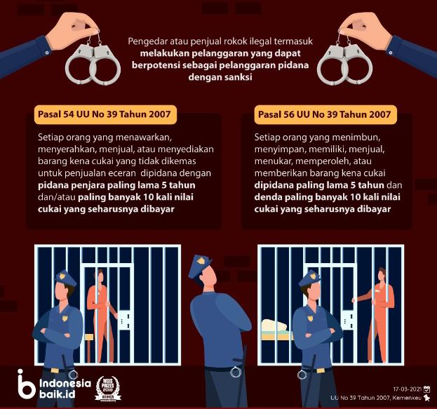 Pengedar atau penjual rokok ilegal termasuk melakukan pelanggaran yang dapat berpotensi sebagai pelanggaran pidana. Sanksi untuk pelanggaran tersebut mengacu pada Undang-Undang RI Nomor 39 Tahun 2007 tentang Cukai, yang berbunyi sebagai berikut: