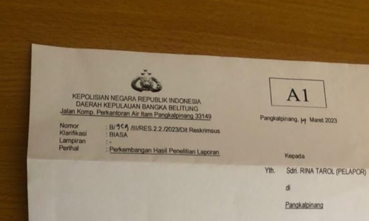 Pangkalpinang – Rina Tarol, merupakan nasabah Bank Sumsel Babel (BSB), merasa dirinya dirugikan melalui David Wijaya, SH dari Kantor Hukum David Sumin & Partners pada tanggal 1 Maret 2023 lalu selaku kuasa Hukumnya, melaporkan Yanhari dan PT, Bank Pembangunan Daerah Sumsel Babel Cabang (BSB) Pangkalpinang, ke Ditreskrimsus Polda Babel.
