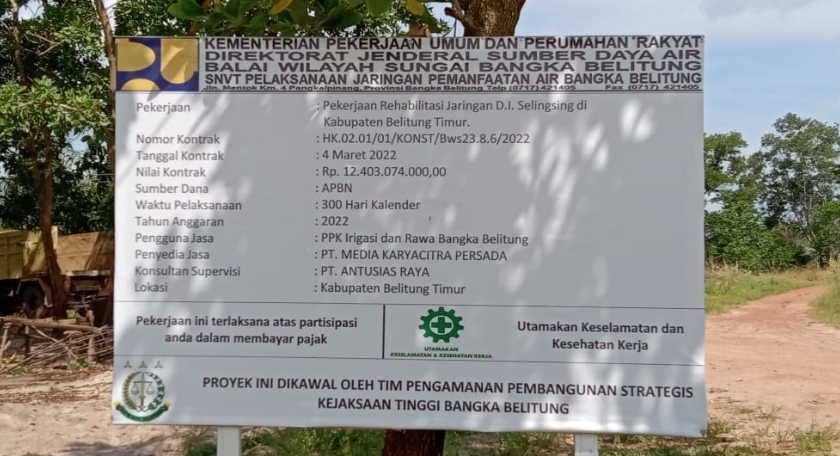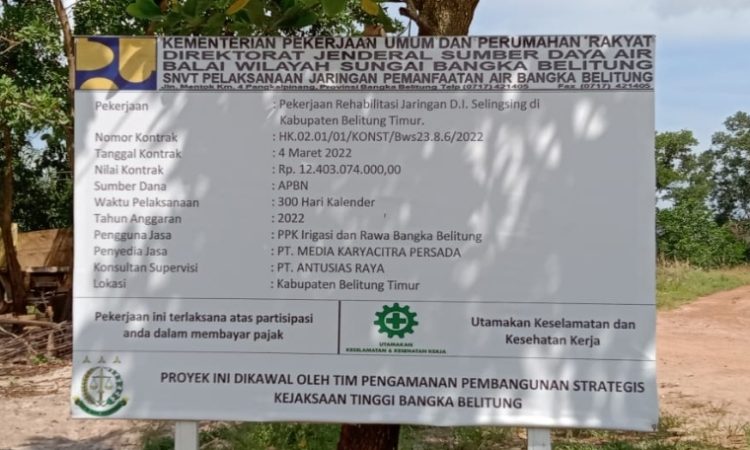 Berdasarkan informasi yang tertera di papan plang Pekerjaan Rehabilitasi Jaringan D.I Selingsing di Kabupaten Belitung Timur merupakan proyek Kementerian PUPR melalui Satuan Kerja Pelaksanaan Jaringan Pemanfaatan Air (PJPA) Bangka Belitung, Balai Wilayah Sungai (BWS) Bangka Belitung Direktorat Jenderal Sumber Daya Air, dengan kontrak nomor : HK. 02.01/01/KONST/BWS 23.8.6/2022 tanggal 4 Maret 2022, sumber dana APBN 2022, waktu pelaksanaan 300 hari kalender, nilai kontrak Rp. 12.403.074. 000,00, Pengguna Jasa PPK Irigasi dan Rawa Bangka Belitung, Penyedia Jasa PT.Media Karyacitra Persada, Konsultan Supervisi PT. Antusias Raya.