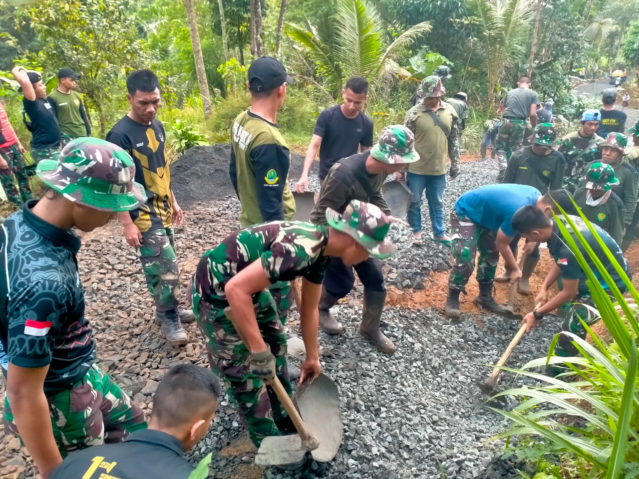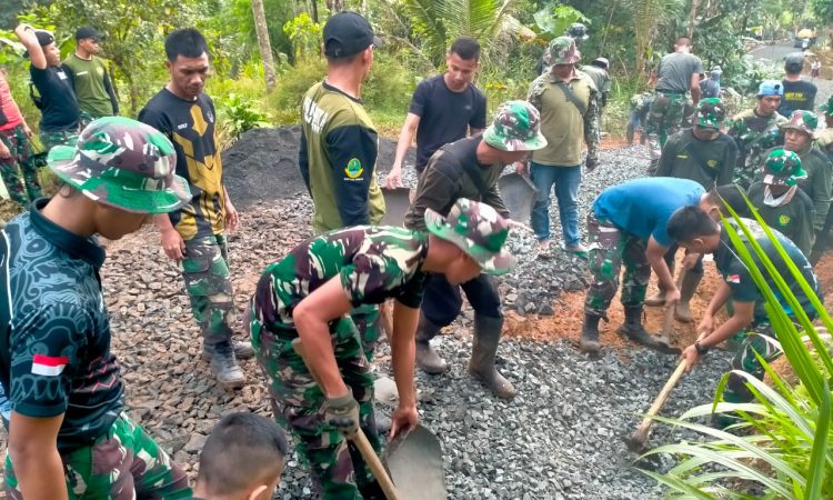 SUKABUMI – TNI AD bersama warga masyarakat bersemangat terlihat saat membangun jalan rusak di Kampung Cikaret, Desa Mekarjaya , Kecamatan Jampangkulon, Kabupaten Sukabumi Jawa Barat.