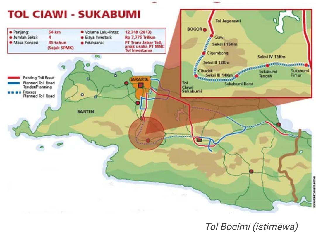 Adapun rutenya setelah dari Bogor-Ciawi-Sukabumi (Bocimi) lalu melalui Ciranjang Kabupaten Cianjur dan Padalarang, Kabupaten Bandung Barat atau Tol Bogor-Sukabumi-Cianjur-Bandung (Bosuciba) juga bakal tersambung ke Banten Via Palabuhanratu jadi Tol lintas Selatan Jawa.