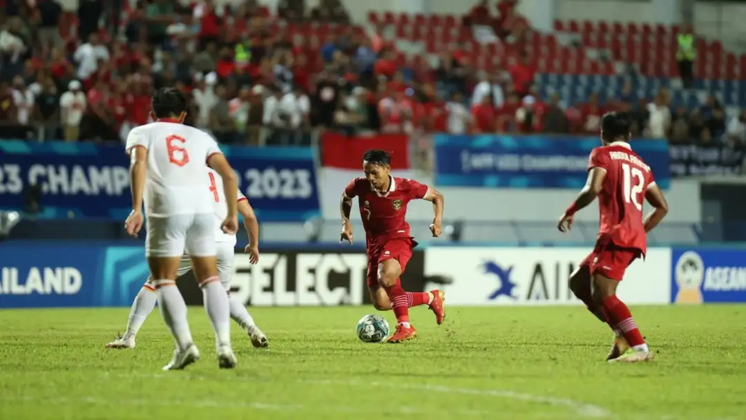 Tujuh menit berselang, Ramadhan Sananta mengambil tendangan, akan tetapi bisa dihalau Quan Van Chuan. Bola yang kurang lengket terlepas dari genggaman dan menghasilkan corner kick.