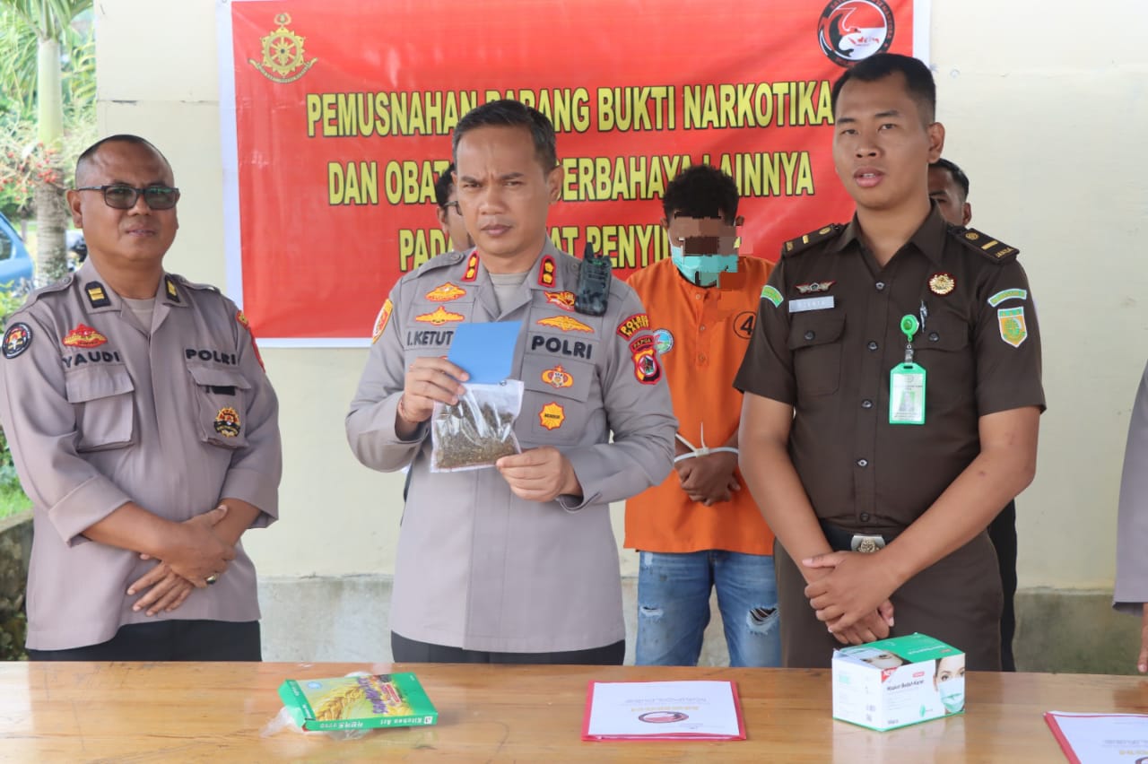 “Pemusnahan barang bukti ini, berdasarkan Surat Perintah Pemusnahan Barang Sitaan, Nomor : SPP-BB / 04 / IX / 2023 / Res Narkoba, Tanggal 21 September 2023, dan Berdasarkan Surat Ketetapan Status Barang Sitaan Narkotika dari Kejaksaan Negeri Nabire, Nomor : B-1013 / R.1.17 / Enz.1 / 09 / 2023, Tanggal 18 September 2023, dengan tersangka S.A.D,” ungkap Kapolres.
