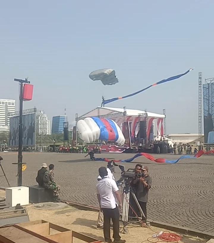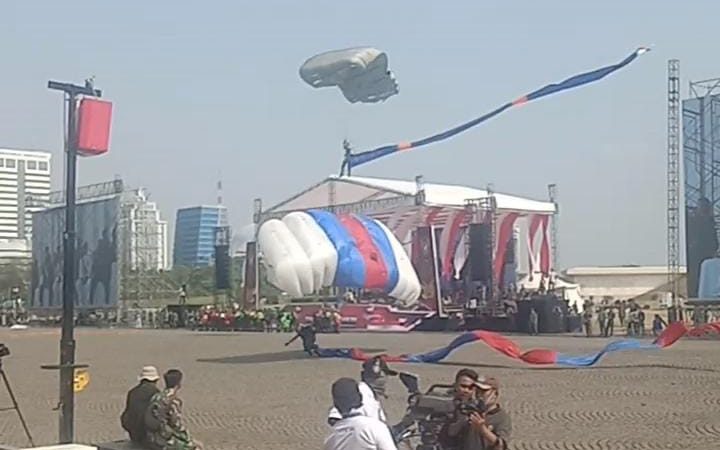 Atraksi terjun payung dengan 78 pasukan serta formasi helikopter yang sangat menarik ditampilkan.