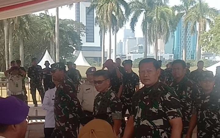 Panglima TNI Yudo bersama Kasad Jenderal TNI Dudung Abdurachman, Kasal Laksamana TNI Muhammad Ali, dan Kasau Marsekal TNI Fadjar Prasetyo tiba sekitar pukul 07.50 WIB.