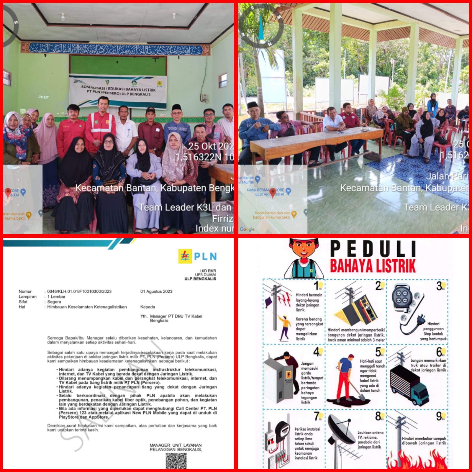 Bengkalis, 25 Oktober 2023 – PT PLN (Persero) Unit Layanan Pelanggan Bengkalis melakukan sosialisasi tentang bahaya listrik ke seluruh stakeholder dan masyarakat, kegiatan ini dimaksudkan untuk meningkatkan kesadaran akan bahaya listrik disekitar kita.