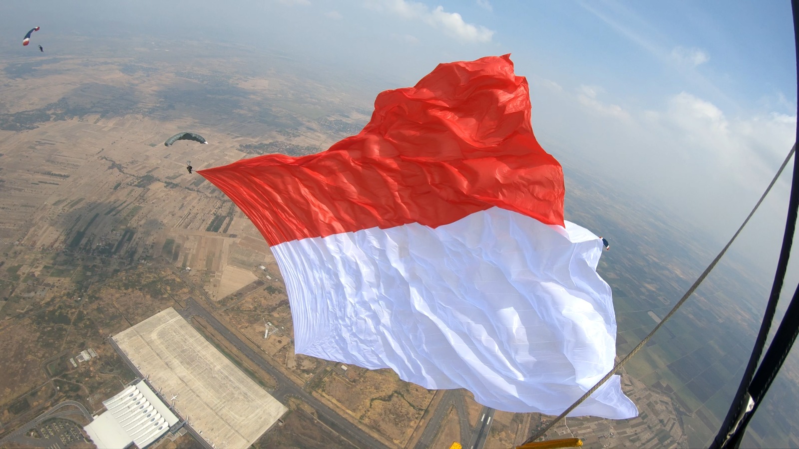 Spesifikasi bendera yang dikibarkan, panjang 61.82 m, lebar 43.7 m, luas bendera 2.701 m2. Total berat bendera keseluruhan 232,4 kg. Peterjun sebanyak 8 orang, terdiri dari 1 peterjun pembawa bendera dan 7 kameramen.