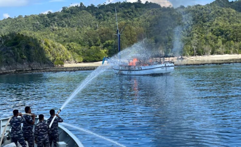 Raja Empat – TNI AL/ Koarmada III. Pada saat melaksanakan Pengamanan Laut di Perairan Selatan Pulau Mansuar Kab Raja Ampat, sekitar pukul 0943 WIT KRI Kapak-625, mendapatkan informasi dari Asops Danguskamla Koarmada III bahwa telah terjadi insiden kebakaran di KLM Indo Siren pada posisi selatan Pulau Pyainemo Kab Raja Empat atau sekitar 25 Nm dari posisi KRI Kapak-625, pada saat itu juga KRI Kapak-625 menambah kecepatan sampai dengan 20 knots untuk mendekati KLM Indosiren. Kamis (30/11/23).