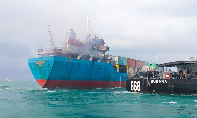 KRI BUBARA-868 BANTU PENANGGULANGAN KEBAKARAN KM ALEXINDO 8 DI PERAIRAN BATAM