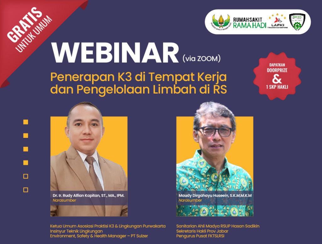 Purwakarta, Pos Berita Nasional – Dalam rangka memperingati Dies Natalis RS Ramahadi Purwakarta yang ke 16 hari ini 22/04/2024 menyelenggarakan Webinar K3 dengan Judul “Penerapan K3 ditempat kerja dan Pengelolaan Limbah di Rumah Sakit” dengan Narasumber Dr. Ir. Rudy Alfian Kapitan, ST., MA., IPM (Ketua Umum Asosiasi Praktisi K3 & Lingkungan Purwakarta ) dan Maudy Dirgahayu Hussein, SKM., MKM (Sanitarian Ahli Madya RSUP Hasan Sadikin Bandung) dengan peserta yang berasal dari perusahaan, rumah sakit, universitas, masyarakat umum serta instansi pemerintah dengan peserta berjumlah sekitar 500 orang.