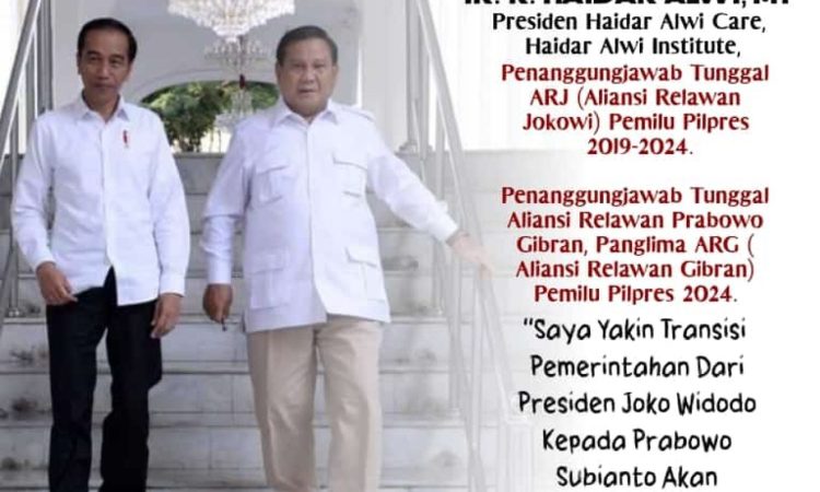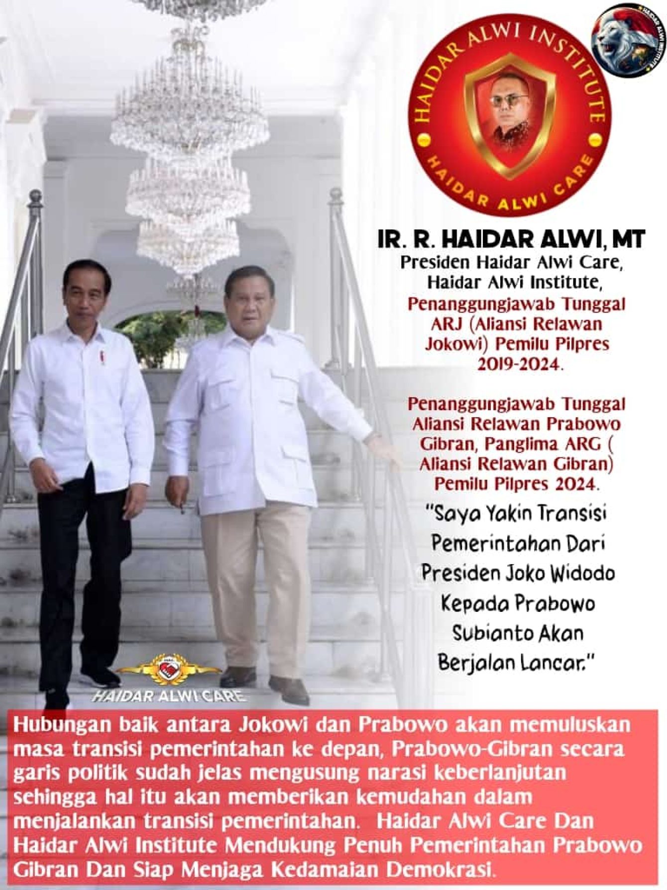 Haidar Alwi menyatakan akan mendampingi presiden periode 2024-2029 Prabowo Gibran dengan kedamaian ” ucap Haidar yang juga dikenal sebagai pengusaha dan organisatoris yang memiliki pengalaman luas di bidang manajemen dan kesejahteraan.(Red).