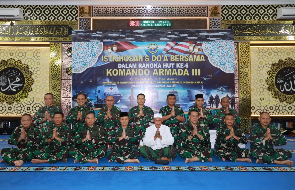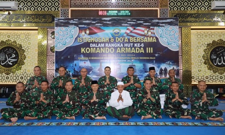 Posberitanasional.com, – Bertempat di Masjid Baiturrahman Koarmada III, Kepala Staf Koarmada III Laksamana Pertama TNI Singgih Sugiarto, S.T., M.Si., dan seluruh Pejabat Utama, Prajurit dan PNS Koarmada III serta Pengurus Daerah/ Anggota Jalasenastri Armada III melaksanakan giat Istighosah dan Doa Bersama dalam rangka memperingati HUT Ke-6 Koarmada III yang jatuh pada tanggal 11 Mei 2024 mendatang, dan Doa Bersama untuk kelancaran pada latihan penembakan senjata khusus yang akan dilaksanakan oleh salah satu Kapal Perang dari Satuan Kapal Cepat Koarmada III. Rabu (08/05/24).