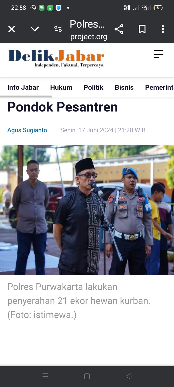 Purwakarta – Di hari Raya Idul Adha 1445 Hijriah, Polres Purwakarta, Polda Jawa Barat, menunjukkan semangat berbagi kebahagiaan dengan menyerahkan 21 hewan kurban kepada masyarakat dan Pondok Pesantren di wilayah Purwakarta.