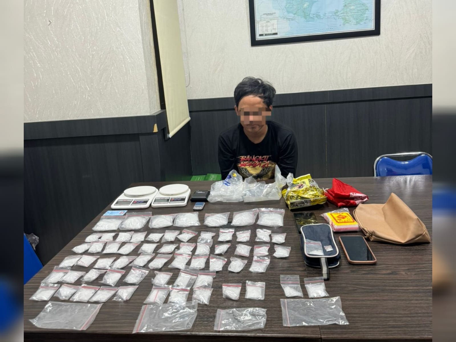 “Barang bukti lain ada 5 plastik strip besar kosong, 1 buah tas warna coklat, 1 buah kantong kain warna merah, 1 buah tas dompet warna biru, 4 unit timbangan digital serta 2 unit handphone,”sambung Jojo.