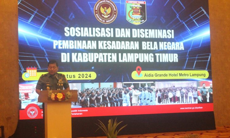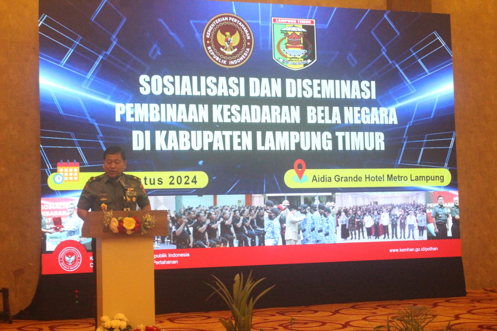 Jakarta – Kementerian Pertahanan Republik Indonesia menggelar Sosialisasi Pembinaan Kesadaran Bela Negara lingkup Masyarakat di Kabupaten Lampung Timur Provinsi Lampung dalam rangka menyebarluaskan Nilai Dasar Bela Negara. Demikian amanat Direktur Jenderal Potensi Pertahanan Mayjen TNI Piek Budyakto  yang dibacakan Direktur Bela Negara Ditjen Pothan Kemhan Brigadir Jenderal TNI G.Eko Sunarto, S.Pd., M.Si dihadapan Ormas, Toga, Todat dan organisasi lainnya lingkup Masyarakat pada saat pembukaan Sosialisasi Kesadaran Bela Negara di Hotel Idia Grande.