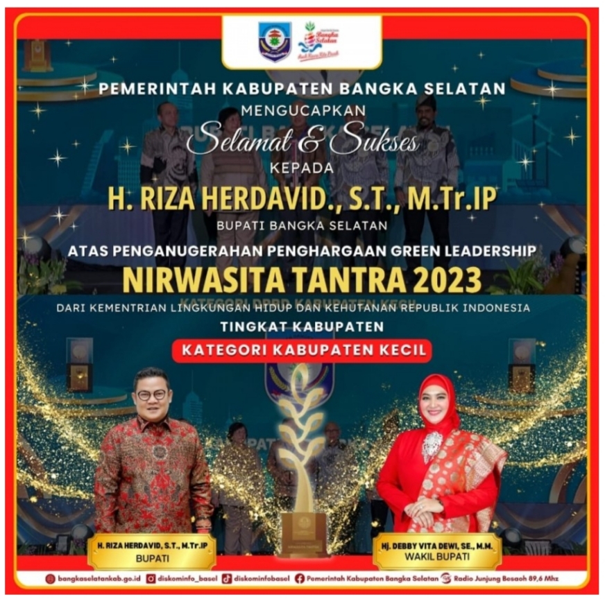 Penghargaan tersebut berupa GREEN LEADERSHIP “NIRWASITA TANTRA” Tahun 2023 diberikan kepada Bupati Bangka Selatan H. Riza Herdavid, S.T., M.Tr.IP., melalui Pj. Sekda Hepi Nuranda, S.T., M.M., bertempat di Auditorium Dr. Ir. Soedjarwo, Gedung Manggala Wanabakti Kementerian Lingkungan Hidup dan Kehutanan, Rabu, (18/9/2024).