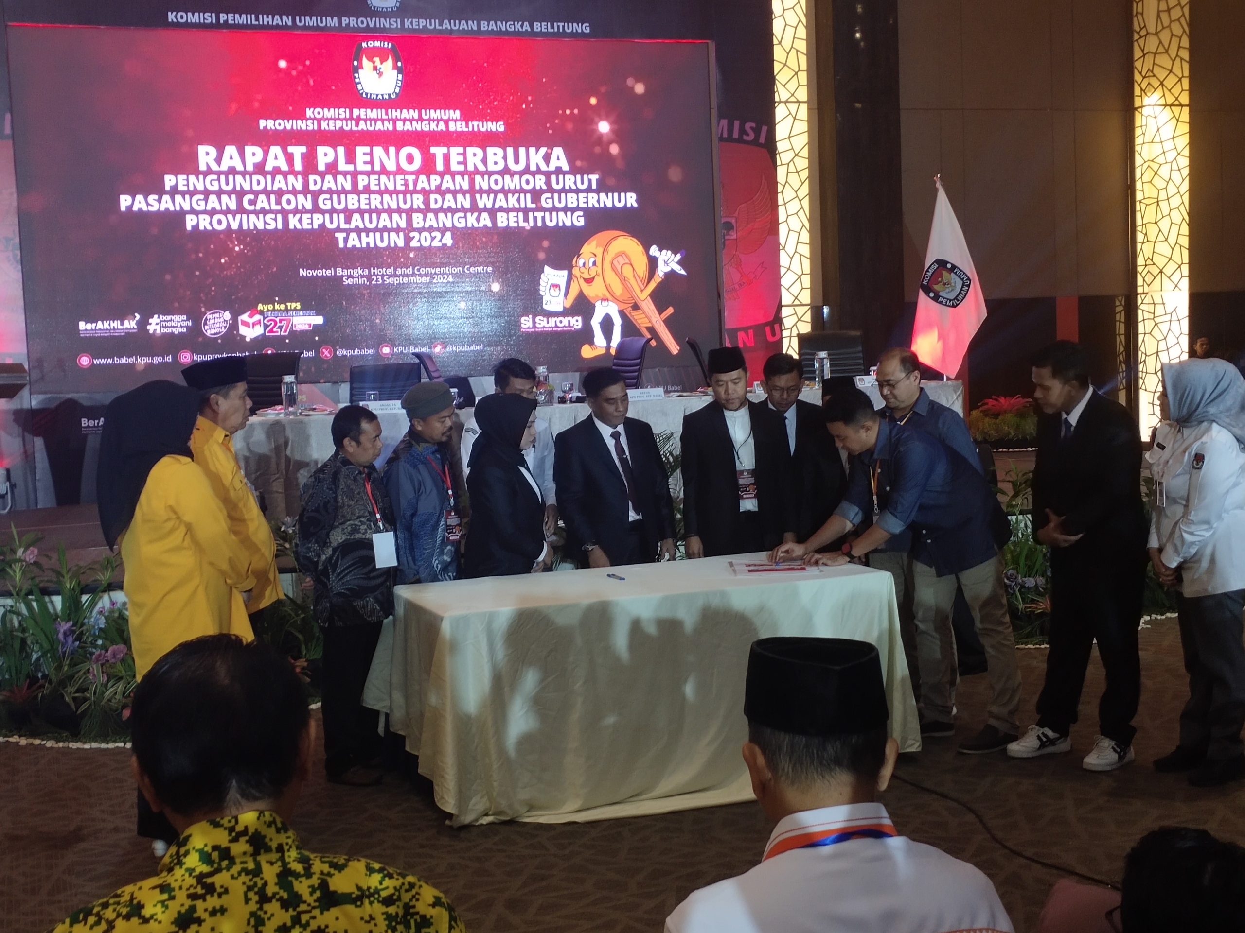 “Inti nya nomor berapa saja,yang penting perjuangan harus berjalan dengan lancar, baik, terarah, fokus dan untuk menang.”kata Erzaldi, ketika diwawancarai awak media usai pengundian nomor urut, bertem di Novotel Pangkalpinang, Senin (23/09/2024) malam.