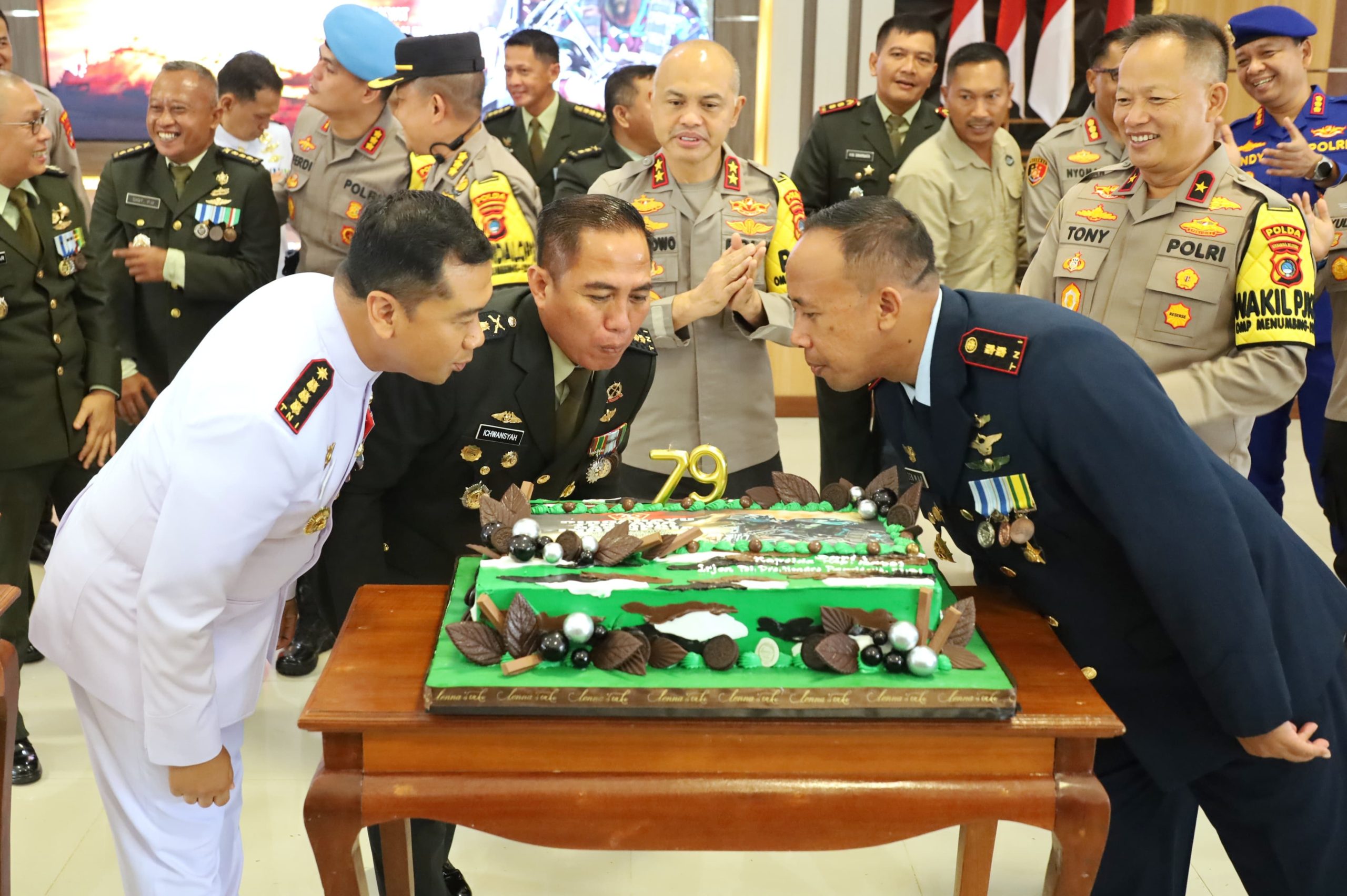 Pangkalpinang, Posberitanasional. com, Dalam rangka mempererat sinergitas TNI-Polri khusunya di Provinsi Bangka Belitung, Kapolda Babel Irjen Pol. Drs. Hendro Pandowo, M.Si., bersama Wakapolda dan PJU Polda Babel memberikan surprise di Hari Ulang Tahun (HUT) TNI ke-79 tahun 2024, berupa tumpeng dan kue ulang tahun, kegiatan berlangsung di Aula Makorem 045/ Garuda Jaya, Sabtu (05/10/24) Pagi.