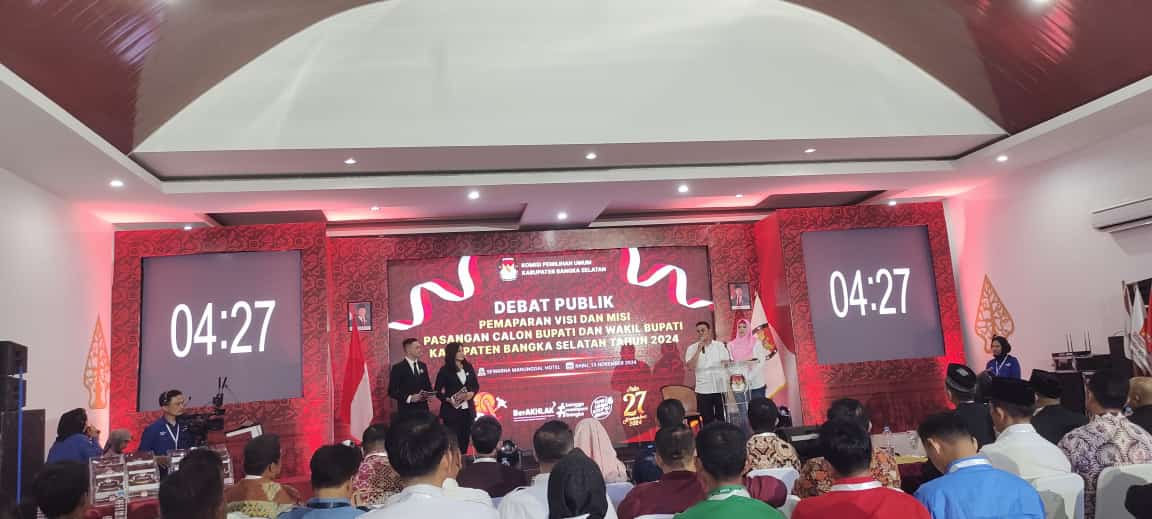 TOBOALI, POSBERITANASIONAL, – Komisi Pemilihan Umum (KPU) Kabupaten Bangka Selatan menggelar debat publik perdana bagi Calon Bupati dan Wakil Bupati di Pilkada Serentak 2024, yang dibuka langsung Ketua KPU Basel Muhidin bertempat di Ballroom Hotel Sewarna Manunggal, Toboali, Kabupaten Bangka Selatan. Rabu 13/11/2024.