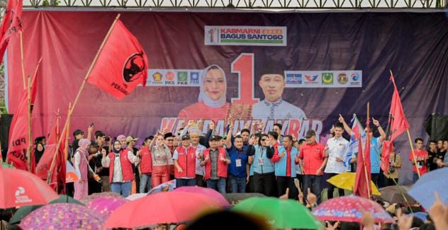 Pinggir – Meskipun Lapangan Suriname, Kelurahan Titian Antui, Kecamatan Pinggir Diguyur hujan, tidak menyurutkan antusias masyarakat untuk menghadiri Kampanye Akbar Pasangan Calon Bupati dan Wakil Bupati Bengkalis Nomor Urut 1 Kasmarni dan Bagus Santoso, (23/11/2024).