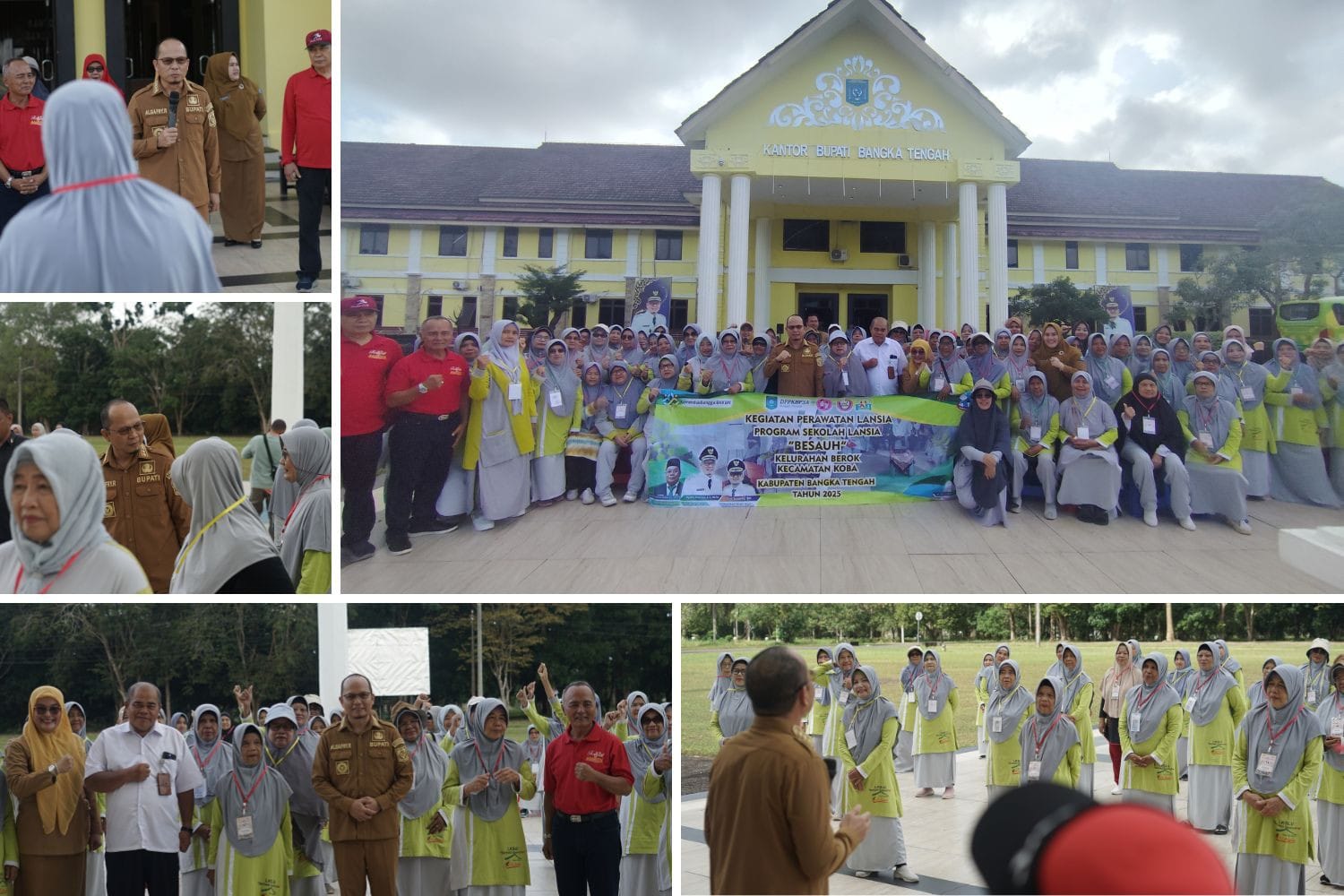 KOBA – Bupati Bangka Tengah, Algafry Rahman, sambut hangat kedatangan 60 siswa Sekolah Lansia Besauh Kelurahan Berok, yang sedang berkunjung dan silaturahmi ke kantor Bupati Bangka Tengah (Bateng), Senin (10/02/2025). Sekolah Lansia ini merupakan binaan Lembaga Kesejahteraan Sosial Lanjut Usia (LKSLU) Rumah Berbagi Al-Mughni, Yayasan Arraisyah Alhams Center, dan menggelar kegiatan perawatan lansia dan Sekolah Lansia Besauh di halaman kantor Bupati Bateng.