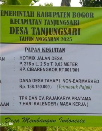 Pengaspalan jalan lingkungan yang berlokasi di Kampung Cibarengkok Rt.001/001, volume P.276.M x L.2,5.M x T.0,03 anggaran yang di pergunakan bersumber dari anggaran Anggaran Pendapatan Belanja Negara (APBN) berupa Dana Desa tahap satu (1) Tahun Anggaran 2025, Sebesar Rp. 138.150.000.