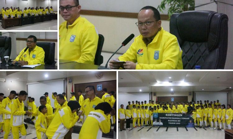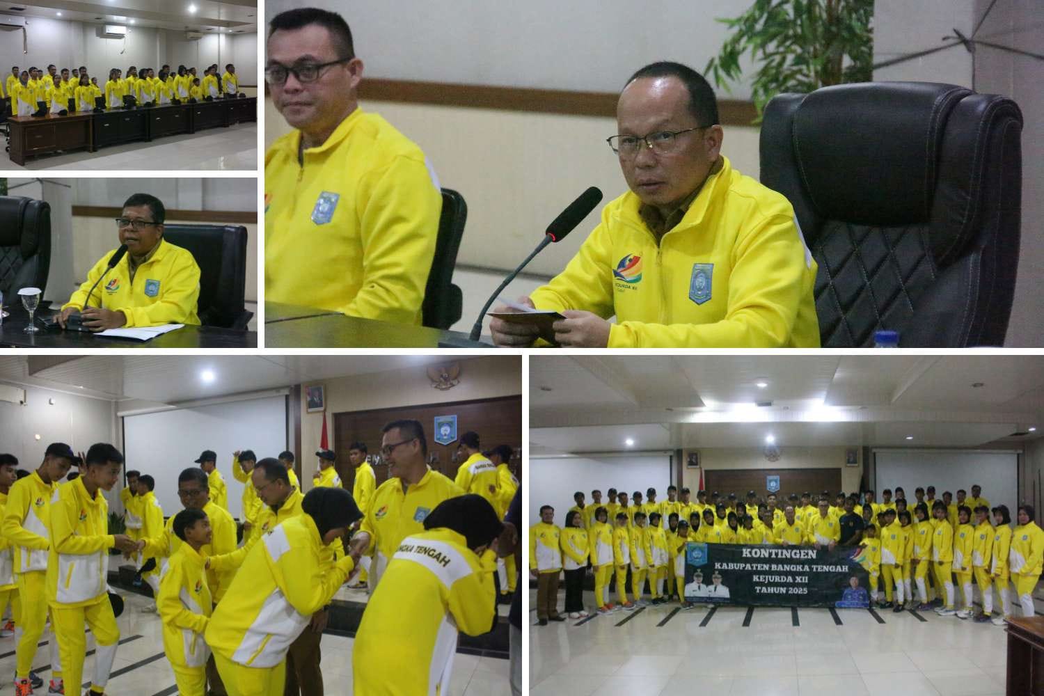 Sebanyak 49 atlet, 13 pelatih, dan 15 official kontingen Bangka Tengah resmi dilepas oleh bupati di Ruang Rapat Besar Kantor Sekretariat Bangka Tengah, Senin (16/06/2025). Turut mendampingi, Kepala Dinbudparpora Bateng, Zainal, Ketua KONI Bateng, dan perwakilan Polres Bangka Tengah.
