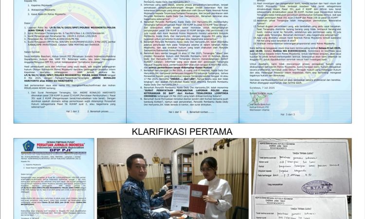 Senin 7 Juli 2025, saya mengirimkan surat klarifikasi/kofirmasi kepada Kapolres Mojokerto dan Kasat Reskrim Polres Mojokerto melalui Surat Klarifikasi No. 018/KLARIFIKASI/VII/2025. Surat diantar langsung. Saya ajukan 14 pertanyaan penting. Sampai batas waktu lewat, tidak ditanggapi. Saya kirimkan lagi Surat klarifikasi ke 2 No. 019/KLARIFIKASI/VII/2025. Namun sampai tulisan ini dipublikasikan, tetap tidak ada tanggapan. Catatan, saat klarifikasi, Kasat Reskrim masih dijabat AKP Nova Indra Pratama. Kasat Reskrim baru ‘Adhi Makayasa’ AKP Fauzy Pratama, sertijab Jum’at 11/5/2025.