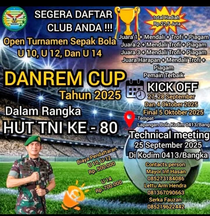 Pangkalpinang,Posbernas – Dalam rangka memperingati Hari Ulang Tahun (HUT) TNI ke-80, Korem 045/Garuda Jaya akan menggelar Open Turnamen Sepak Bola Danrem Cup 2025 untuk kategori U-10, U-12, dan U-14. Turnamen ini terbuka untuk seluruh klub sepak bola usia dini di Bangka Belitung.