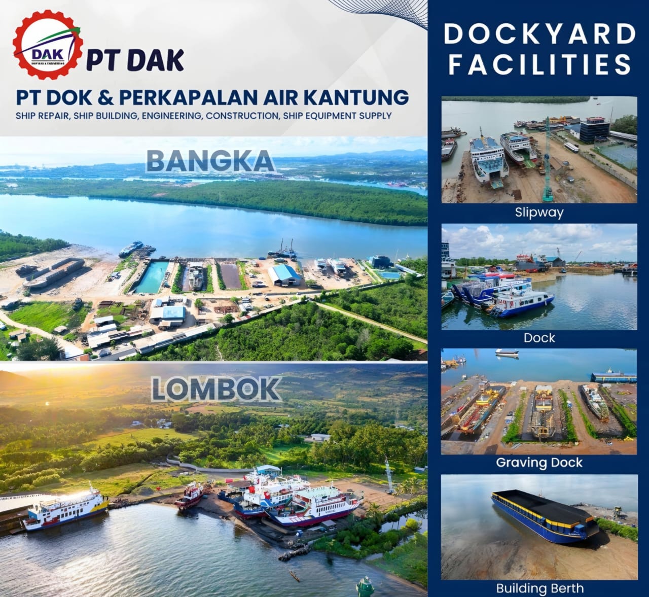 Selain membangun kapal baru, PT DAK juga memberikan layanan perawatan dan perbaikan kapal di dua galangan utamanya — Air Kantung (Bangka) dan Lombok. Kedua fasilitas ini menjadi pusat docking dan undocking kapal di kawasan barat dan timur Indonesia, menjadikan PT DAK sebagai pilihan utama bagi berbagai mitra, baik dari sektor pemerintahan maupun swasta.