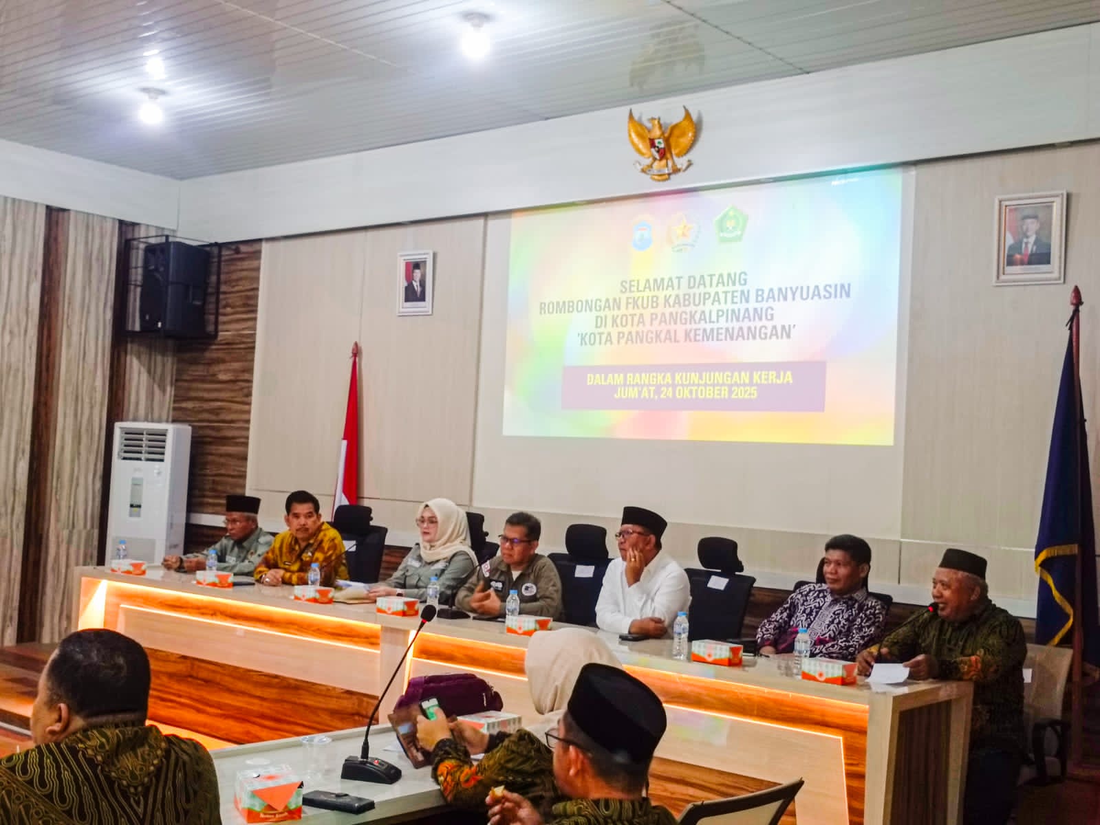 PANGKALPINANG,POSBERNAS – Asisten Pemerintahan dan Kesejahteraan Rakyat (Kesra) Setda Kota Pangkalpinang, Akhmad Subekti, menghadiri acara kunjungan kerja Forum Kerukunan Umat Beragama (FKUB) Kabupaten Banyuasin ke FKUB Kota Pangkalpinang, yang berlangsung di Ruang Pertemuan Bapperida Pangkalpinang, Jumat (24/10/2025).