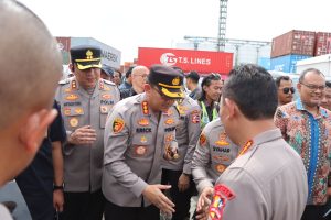 Jakarta – Kapolres Pelabuhan Tanjung Priok AKBP Dr. Martuasah H. Tobing, S.I.K., M.H., memimpin Pengamanan Konferensi Pers, Kepolisian Negara Republik Indonesia bersama Kementerian Keuangan terkait pengungkapan kasus ekspor ilegal produk turunan Crude Palm Oil (CPO) di Buffer Area NPCT 1, Kalibaru, Jakarta Utara. Sebanyak 87 kontainer berisi produk turunan sawit dengan nilai kerugian negara mencapai Rp2,8 triliun berhasil diamankan dalam operasi bersama ini.