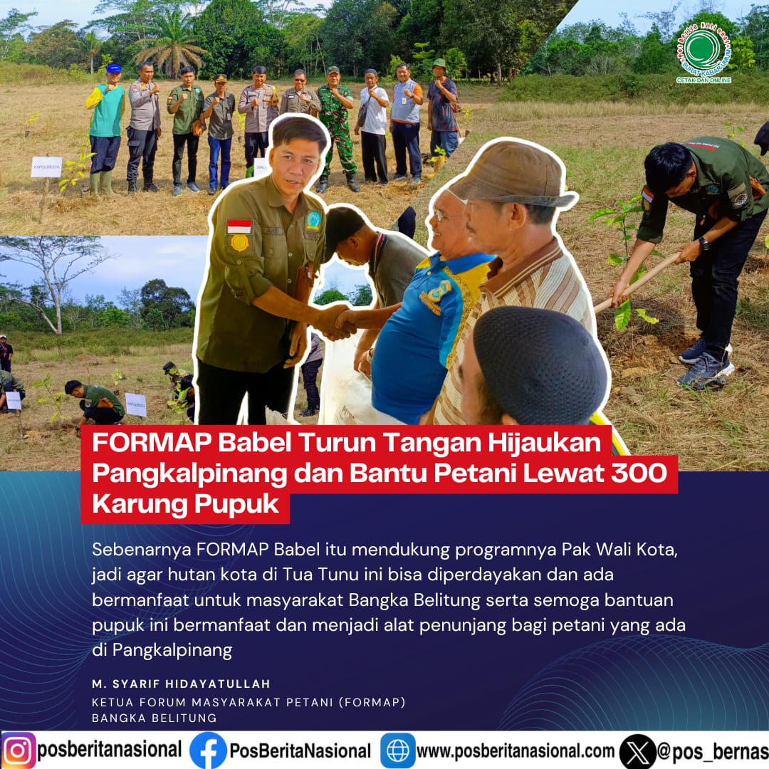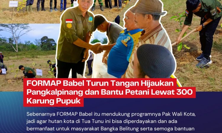 PANGKALPINANG,POSBERNAS — Forum Masyarakat Petani (FORMAP) Bangka Belitung menunjukkan komitmen kuat untuk mendukung visi pembangunan hijau Pemerintah Kota Pangkalpinang. Hal itu diwujudkan melalui kegiatan penanaman pohon dalam rangka Hari Menanam Pohon Sedunia dan penyerahan 300 karung pupuk kepada petani di Hutan Raya Tua Tunu, Jumat (21/11/2025).