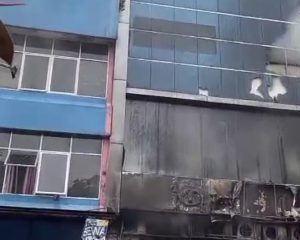 Terlihat pula sejumlah kaca di gedung tersebut pecah di setiap lantainya. hitam pekat bekas kebakaran juga terlihat membekas di jendela maupun bangunan tersebut.