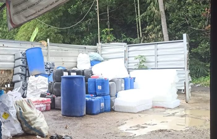 Di lokasi tersebut terlihat jejeran jerigen dan karung yang diduga berisi bahan baku maupun limbah produksi disimpan di area halaman terbuka tanpa adanya ruangan khusus atau sistem pengamanan (safety storage) sebagaimana diwajibkan dalam regulasi pengelolaan B3. Kondisi ini dinilai berpotensi membahayakan lingkungan sekitar serta kesehatan masyarakat dan pekerja.