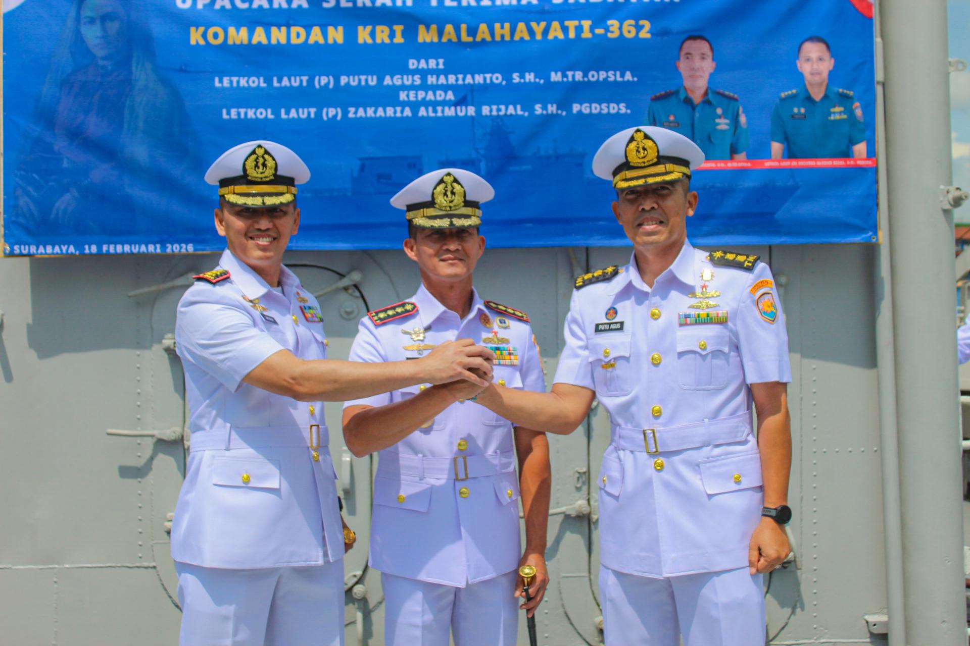 POSBERNAS – Serah Terima Jabatan Komandan KRI Malahayati-362 dilaksanakan di Geladak Tengah kapal dengan khidmat dan penuh semangat. Jabatan Komandan diserahkan dari Letkol Laut (P) Putu Agus Harianto, S.H., M.Tr.Opsla. kepada Letkol Laut (P) Zakaria Alimur Rijal, S.H., PGDSDS dalam sebuah upacara yang dipimpin oleh Komandan Satuan Kapal Eskorta Koarmada I, Kolonel Laut (P) Dodi Hermanto, M.Tr.Hanla., selaku Inspektur Upacara di PT.PAL Surabaya pada Jumat 20 Februari 2026 Kegiatan ini menjadi bagian dari dinamika pembinaan organisasi serta penyegaran kepemimpinan di lingkungan Koarmada I.