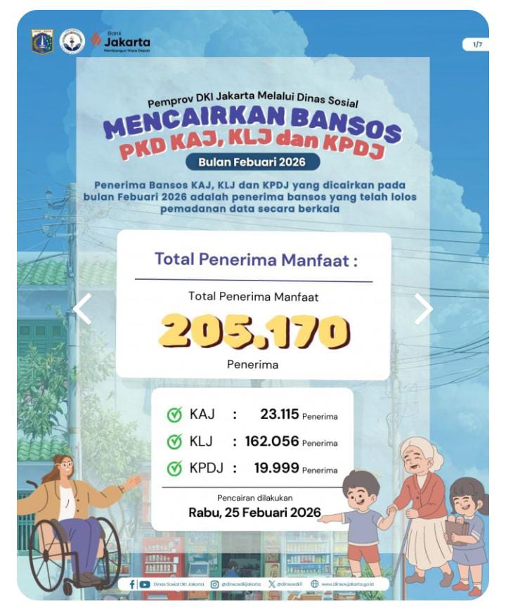 Jakarta – Pemprov DKI Jakarta melalui Dinas Sosial kembali menyalurkan Bantuan Sosial PKD (KAJ, KLJ, dan KPDJ) pada Februari 2026.