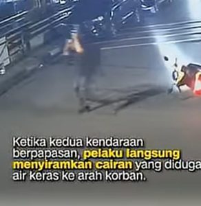 Salah satu pelaku,kemudian menyiramkan air keras ke arah korban hingga mengenai sebagian tubuh korban dan korban menjatuhkan sepeda motornya berlari dan menjerit kesakitan meminta pertolongan warga setempat.