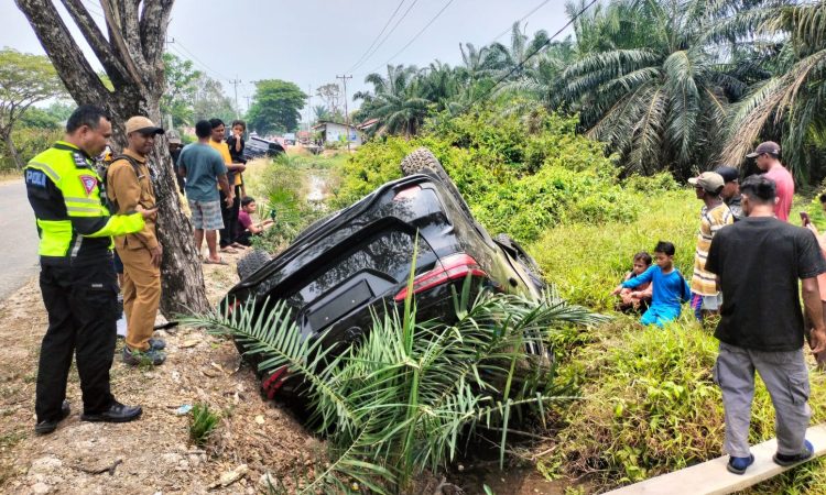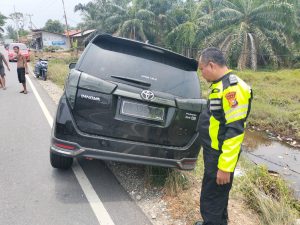 Personel Satlantas Polres Bengkalis berada di lokasi saat mobil dinas Wakil Ketua II DPRD Bengkalis terperosok ke dalam parit di sisi Jalan Lintas Dumai–Pakning, Desa Parit I Api-Api, Kecamatan Bandar Laksamana, Selasa (31/3/2026).