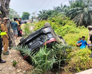 Personel Satlantas Polres Bengkalis berada di lokasi saat mobil dinas Wakil Ketua II DPRD Bengkalis terperosok ke dalam parit di sisi Jalan Lintas Dumai–Pakning, Desa Parit I Api-Api, Kecamatan Bandar Laksamana, Selasa (31/3/2026).